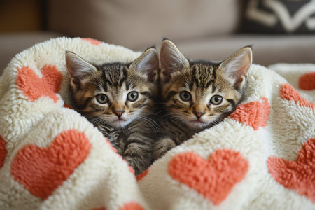 Two kittens are keeping warm under a soft blanket decorated with hearts