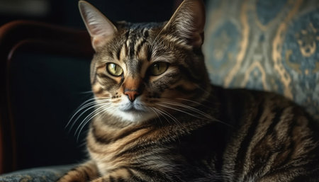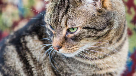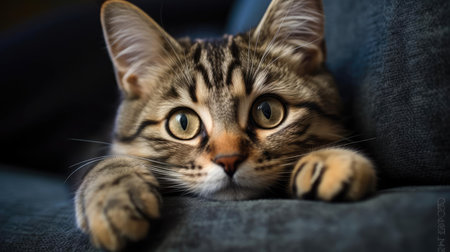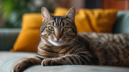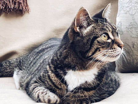 Beautiful female adult tabby cat on sofa at home, lovely adorable pet, portrait.