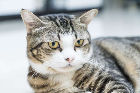 tabby and domestic cat in the interior of a room of a home resting with the background out of focus