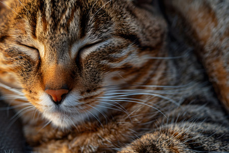 A close-up photograph of a tabby cat peacefully sleeping, showcasing the intricate patterns of its striped fur. the warm lighting highlights the soft textures and delicate features, creating a serene and cozy atmosphere ideal for pet-themed designs. Generative AI