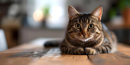 Feline perched on tablettop exuding curiosity with gentle poise. Concept Cat Portraits, Tabletop Photography, Curious Feline, Gentle Poise