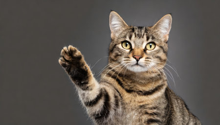Delightful image of a domestic cat enthusiastically giving a high five, beautifully isolated on a crisp white background. This captivating moment showcases the playful nature of felines in an