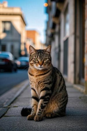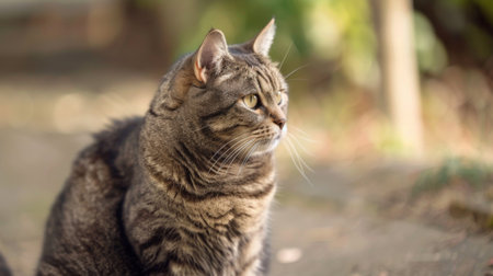 A striking tabby cat observes its surroundings in stillness during dusk.