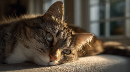 A serene portrait of a domestic cat resting in soft natural light, showcasing its relaxed demeanor and tranquil expression in a cozy indoor setting.
