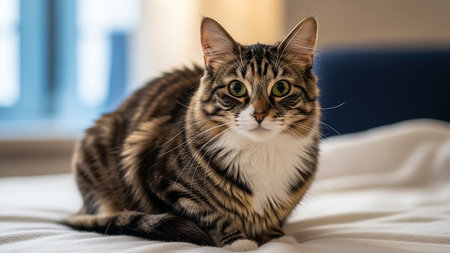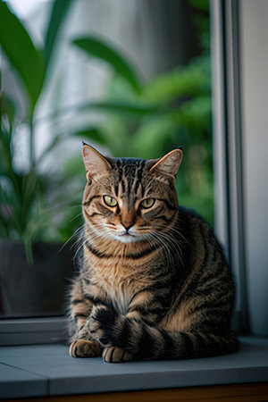 Beautiful tabby cat sitting on a window sill and looking at the camera