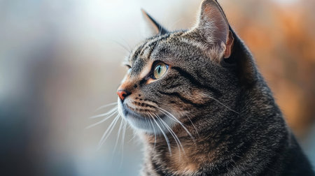 A Majestic Striped Tabby Cat with Intelligent Gaze Posed Elegantly Against a Soft Gray Background