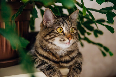 A domestic gray tabby cat sits on a shelf next to indoor plants. Cozy home background with a pet fluffy pet.