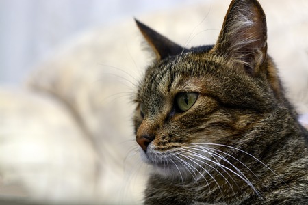 Closeup portrait of cute adorable tabby cat with stripes and green eyes sitting looking away. Domestic pet indoors at home. Toned with vintage retro modern hipster film filters, lifestyle.