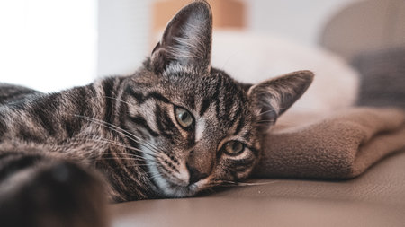 Portrait of a tabby cat on a blurred background. Selective focus.