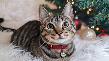This charming tabby cat with vibrant green eyes rests gracefully in front of a beautifully decorated Christmas tree, exuding warmth and festive joy for the holiday season.