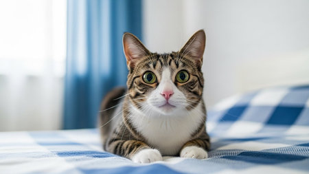 Domestic tabby cat lying on blue checkered bedspread, looking directly at camera.
