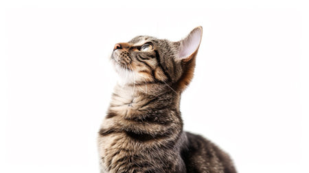Closeup photo of a cat looking up, against on a white background. Generated by artificial intelligence.