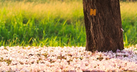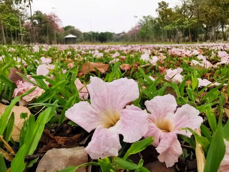 Flower of pink trumpet tree falling on ground