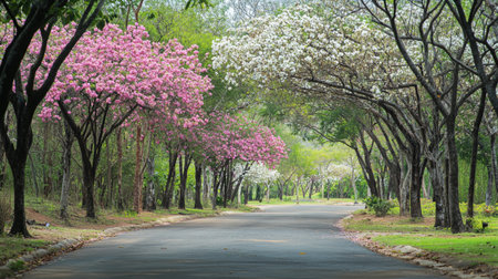 Beautiful pink flowers blooming on the road in the park.