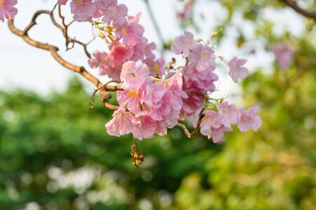Full blossom of pink trumpet tree or Tabebuia rosea in spring season, Soft focus amazing floral tabebuia pink tree flower.