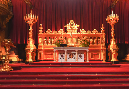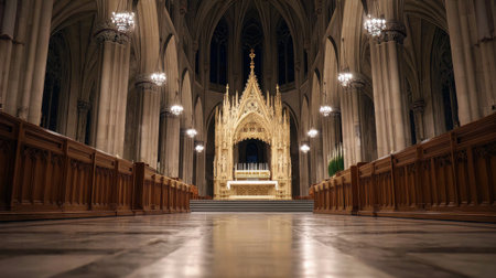 This captivating image showcases the breathtaking interior of a grand cathedral featuring an ornate altar. Elegant lighting enhances the architectural beauty, creating a serene atmosphere suitable for reflection and worship.