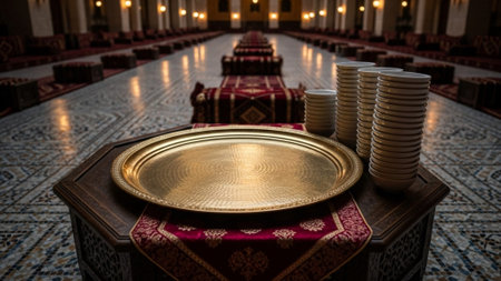 A cinematic, panoramic 16:9 wide shot set in a grand Arabian dining hall at twilight, focusing on th