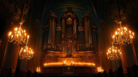 A vintage church organ with glowing candlelight, exuding a warm, spiritual ambiance, set in a grand cathedral interior.