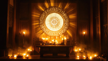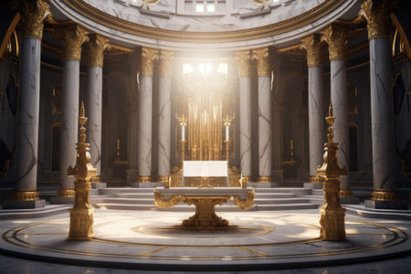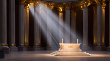 Explore a captivating temple interior featuring grand columns and a luminous altar. Rays of light create a serene atmosphere, evoking spiritual tranquility and elegance.