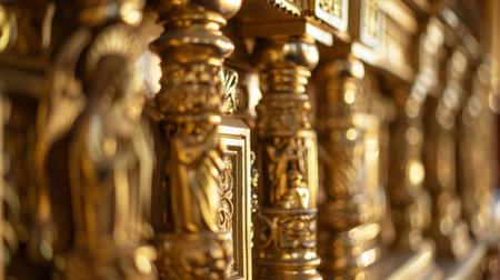 Detailed close-up of a wall adorned with lavish gold decorations, showcasing intricate patterns and designs. The golden embellishments create a striking contrast against the walls surface.