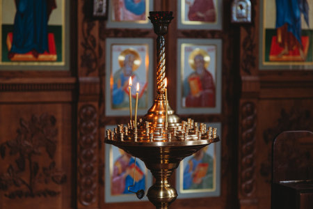 Orthodox Church. Christianity. Festive interior decoration with burning candles and icon in traditional Orthodox Church on Easter Eve or Christmas. Religion faith pray symbol