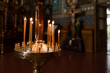 close up of wax candles in orthodox Christian church.