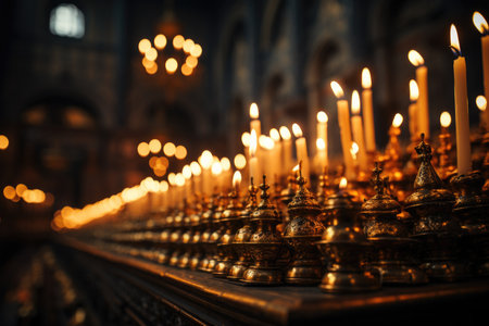 A group of lit candles illuminating a church. Perfect for religious or spiritual themes.