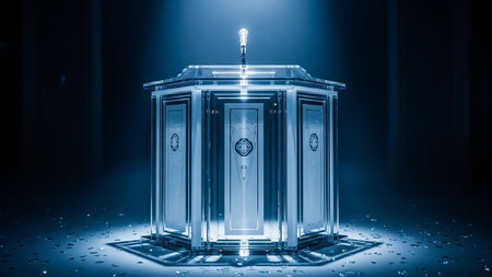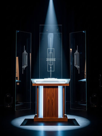 A futuristic podium made of wood and glass, featuring geometric etchings and illuminated by a dramatic spotlight against a dark background.