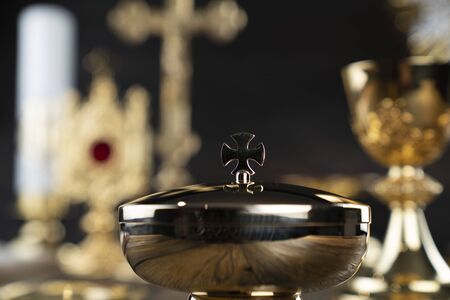Catholic religion concept. Catholic symbols composition. The Cross, monstrance, Holy Bible and golden chalice on wooden altar and gray background.