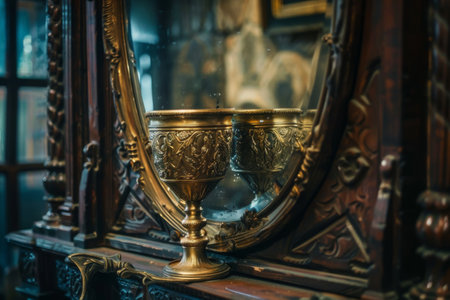 A golden cup and a piece of bread are placed on a table. The cup is filled with liquid, and the bread is placed next to it. Concept of celebration or a special occasion, as the cup