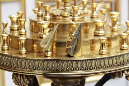 Candlestick in the Orthodox Church for the wax candles in front of the icon and two brass caps to extinguish the candles.