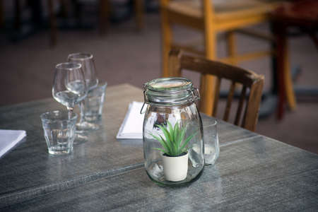 closeup of glasses and decoration on the table at the restaurant terrasse in the street