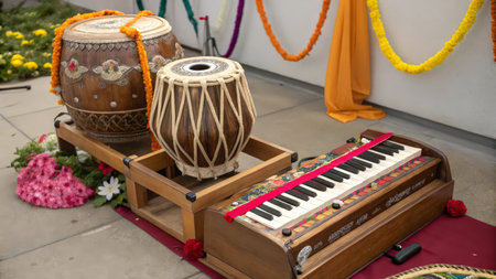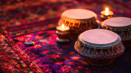 Vibrant scene featuring traditional Indian tabla drums arranged on colorful fabric with soft candlelight, perfect for themes of music, culture, and celebration.