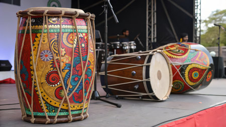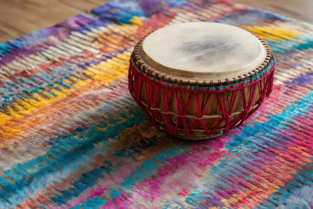 Tabla drum resting on a colorful woven mat, showing intricate craftsmanship and cultural richness in a vibrant setting