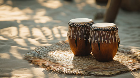 A captivating scene featuring two traditional drums resting on a straw mat on a tranquil beach. The natural lighting casts beautiful shadows, creating a serene ambiance perfect for music and relaxation.
