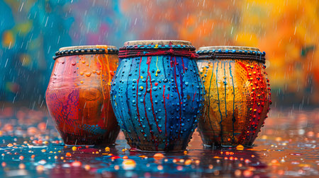 Traditional drums, wet from raindrops, on a colorful background, capturing the essence of World Music Day amidst a downpour.