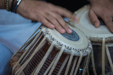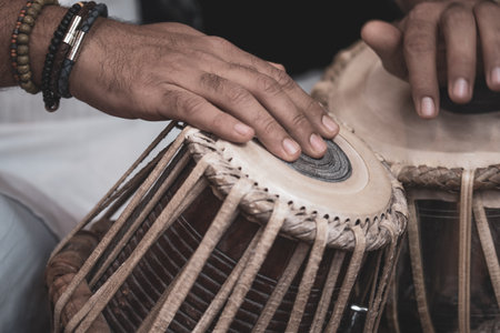 close up image of musician hand playing tabla, an indian classical music instrument with focus on front hand