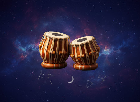 Two traditional Indian tabla drums are set against a vibrant, starry cosmic background featuring a nebula, moon, and subtle constellations