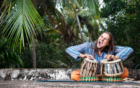 Man playing on traditional Indian tabla drums at tropic background