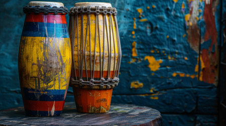 A pair of vibrant traditional drums painted in bright colors, displayed against a textured blue wall, highlighting cultural and artistic craftsmanship.