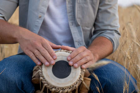 Close-up of a man playing a djembe sitting in a wheat field