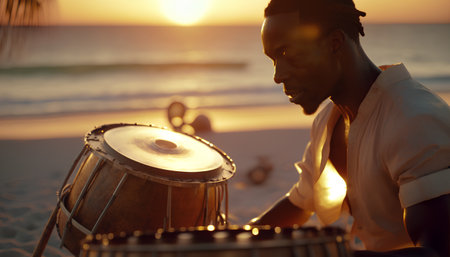 African american man playing drums on the beach at sunset, portrait