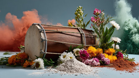 This image features a wooden drum surrounded by an array of colorful flowers and powdered spices, creating a vibrant and artistic still life display.
