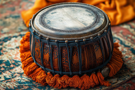 Intricately carved traditional Indian drum positioned on a patterned rug with orange fringe highlights. Cultural representation of Indian music and craftsmanship artistry.