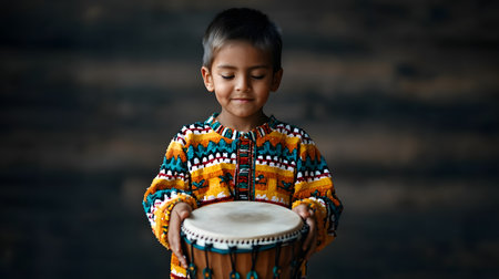 A joyful Native American child holds a drum, showcasing concentration and excitement amidst a blurred background.