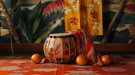 A beautifully styled drum stands amidst vibrant fabric, fruits, and tropical decor, creating a serene and artistic atmosphere that celebrates culture and creativity.