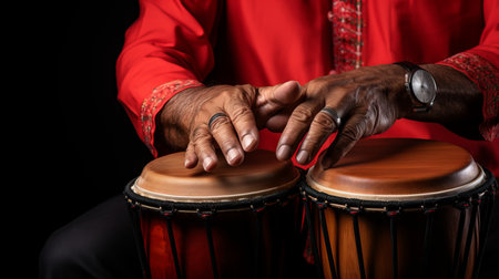 Fingers expertly dance on the surface of conga drums, producing vibrant beats that resonate in the air. A captivating performance unfolds as cultural rhythms fill the intimate space.
