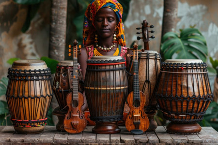 A beautiful African woman wearing a colorful headdress and traditional clothing is sitting next to a djembe and a violin.