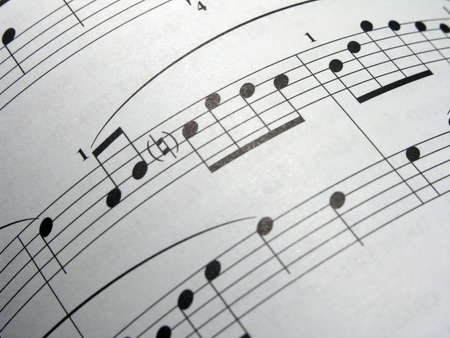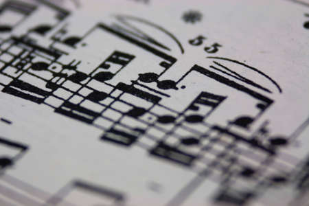 Detail view on music sheet with black notes on the white paper. The sheet is written for piano.
