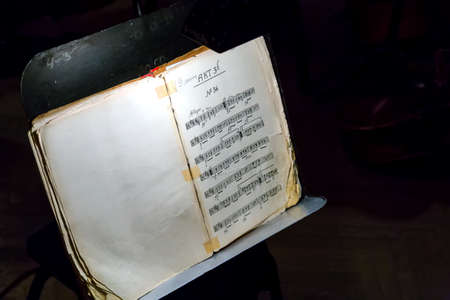 Old book with music notes on the dark background. Selective focus.